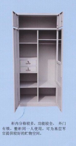 外形尺寸:長900mm,深550mm,高2000mm。柜內(nèi)分格較多,功能較全,門外有鎖,整柜供一人使用,可為軍官提供較好的儲物空間。